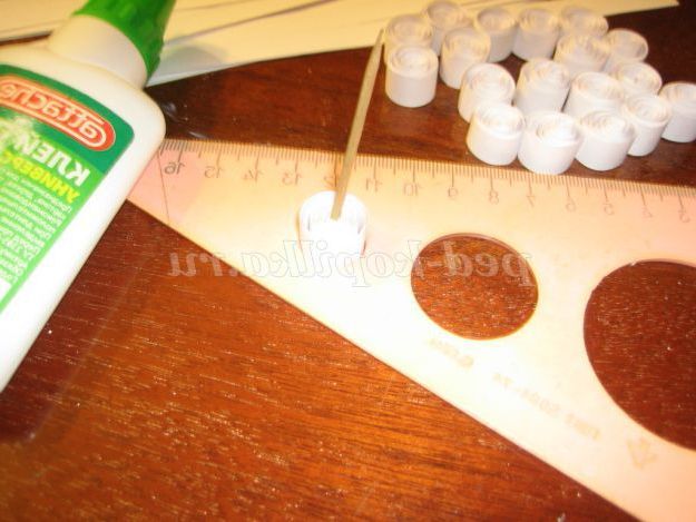 Для роботи вам знадобляться: двосторонній кольоровий і білий папір; клей ПВА; ножиці; зубочистка; лінійка з колами (застосовується для формування ролів); олівець; файл.