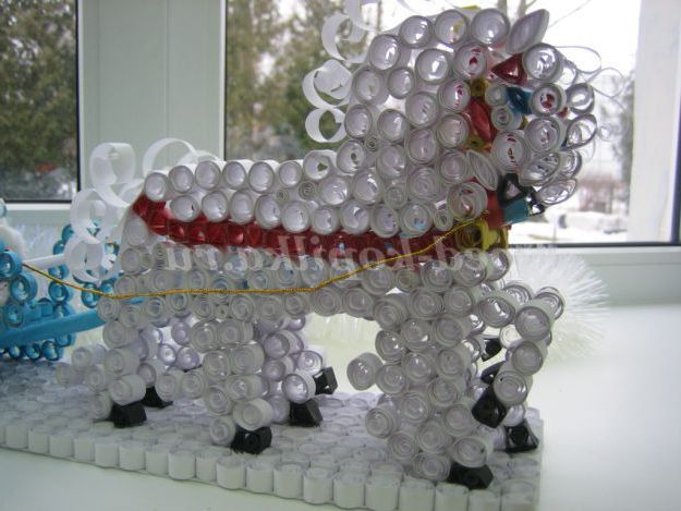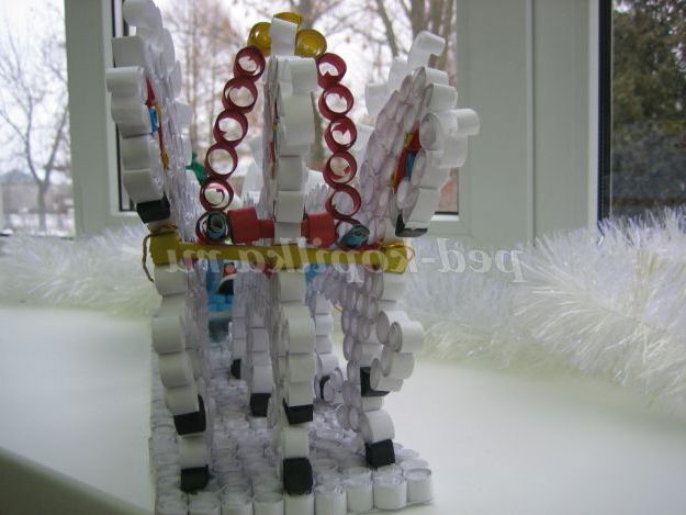 8. Порожній простір «коня» закрити білими ролами, приклеюючи їх один до одного. Приклеїти хвіст, гриву, сніг, що летить з-під копит. Дати виробі висохнути і тихенько від'єднати від файлу. Зробити три таких коня