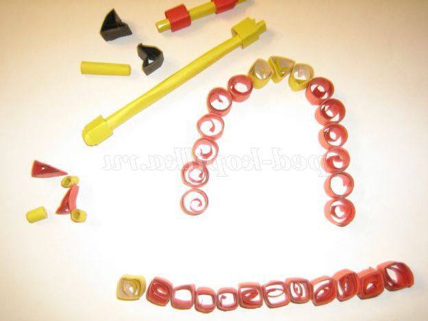 10. За допомогою клею, «коней» зміцнити на підставі, між собою їх скріпити трубкою жовтого кольору з паперу довжиною 11 див. Трубку пропустити через жовті роли на грудях у кожного коня, закріпити клеєм. Приклеїти дугу з кільцями для голоблею. Дати висохнути поделке