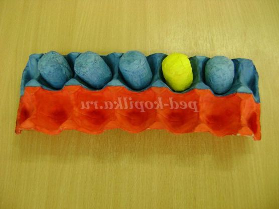 Вихователь показує дітям розкладені, наприклад, сині яєчка в синіх клітинок і серед них одне жовте яєчко. Пропонує дітям назвати, яке яєчко зайве, чому.