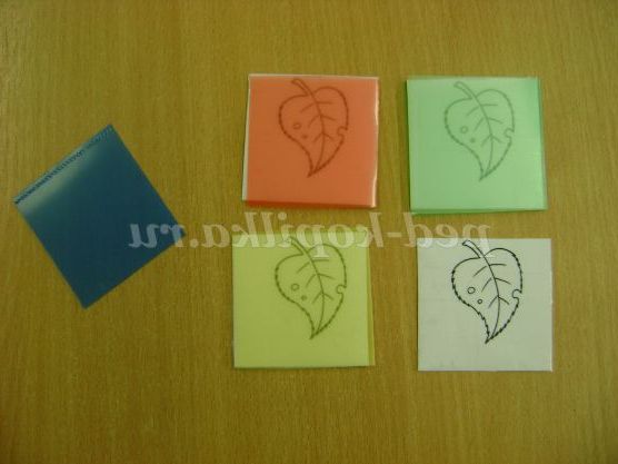 Діти здогадуються, що це листок і розфарбовують листочки в різні кольори за допомогою кольорових скелець. Називають, якого кольору вийшли листочки.