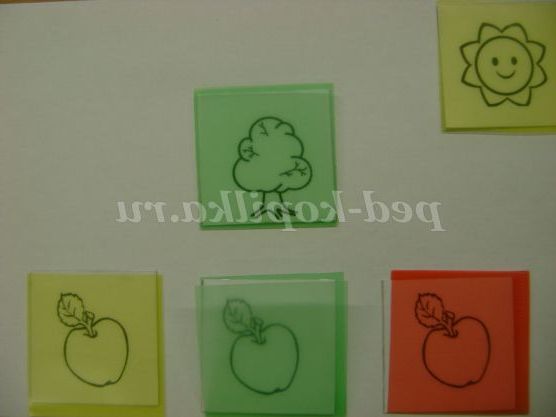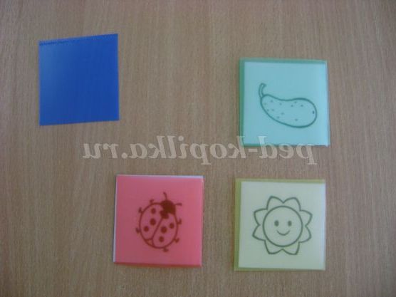 Хід гри: вихователь пропонує кожній картинці підібрати кольорове скельце і розфарбувати її.