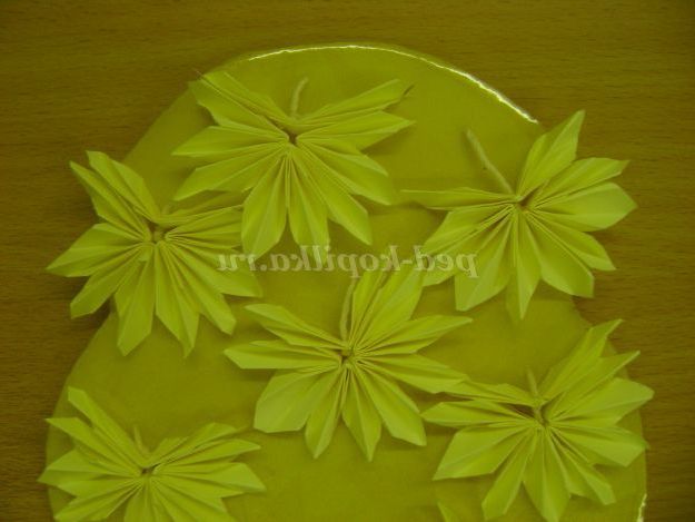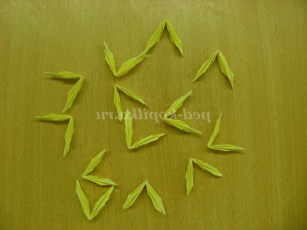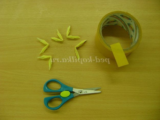 9. Будемо з них робити осіннє листя для нашого дерева. Листя схожі на кленові. Для кожного потрібно 5 модулів-галочок, двосторонній скотч і ножиці.