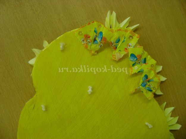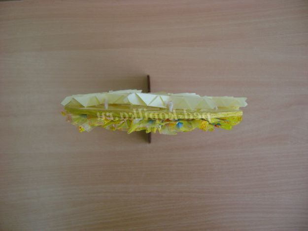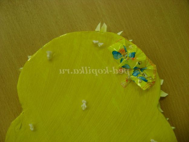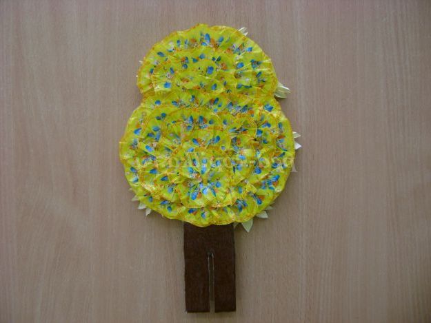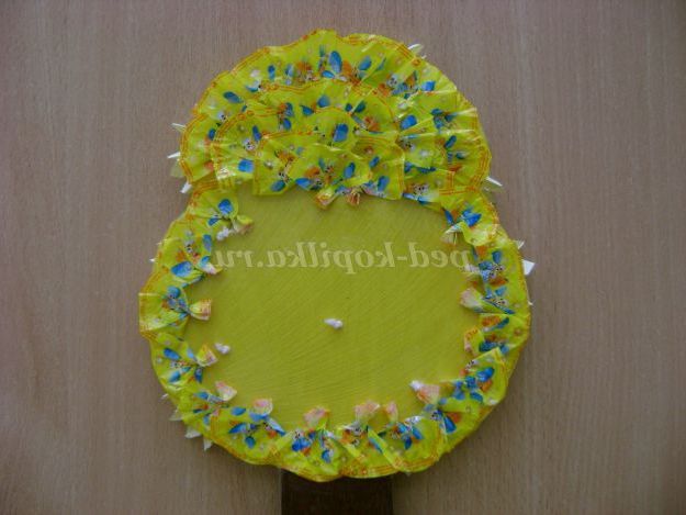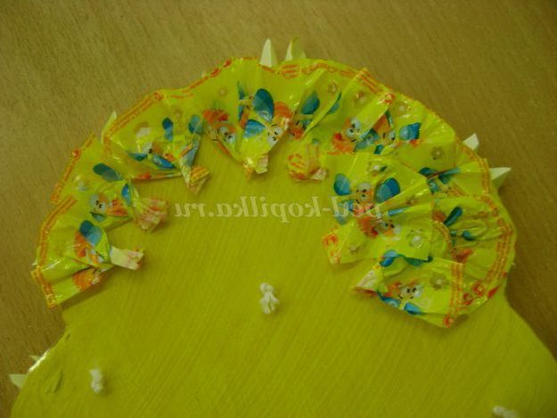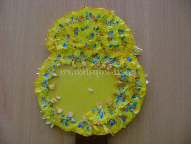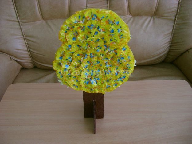 17. Зворотна сторона дерева виглядає не естетично. Треба закрити вузлики. Для цього беремо фантики від цукерок жовтого кольору. Я скористалася фантиками від цукерок «Шалена бджілка» (цукерок було 500 г).
