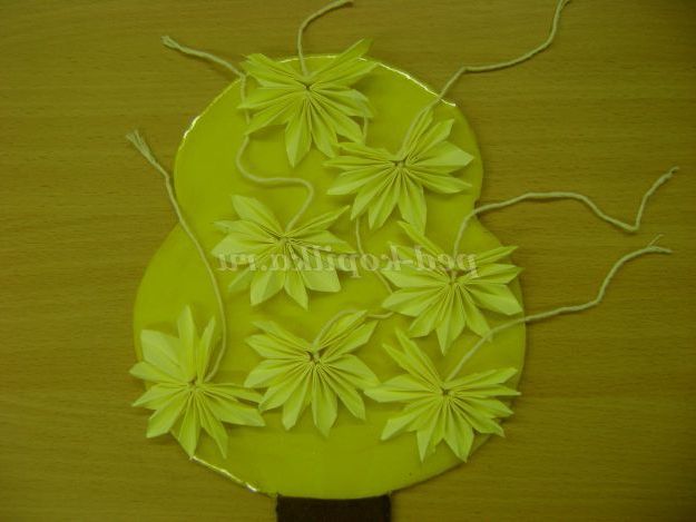 18.Декорируем зворотний бік крони дерева. Починаємо приклеювати заготовки по одній з допомогою двостороннього скотча. Починаємо зліва направо.