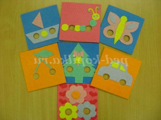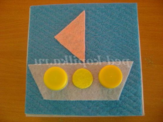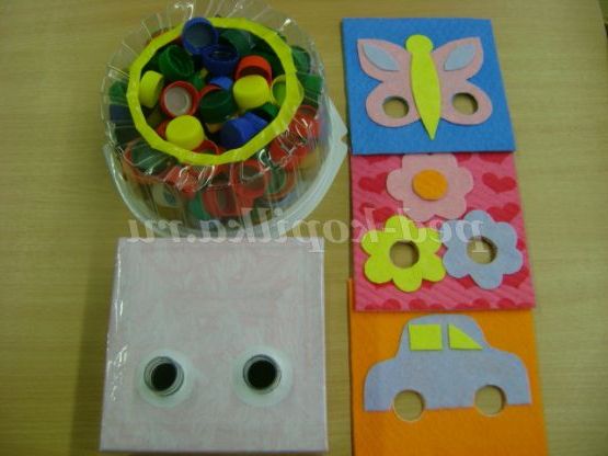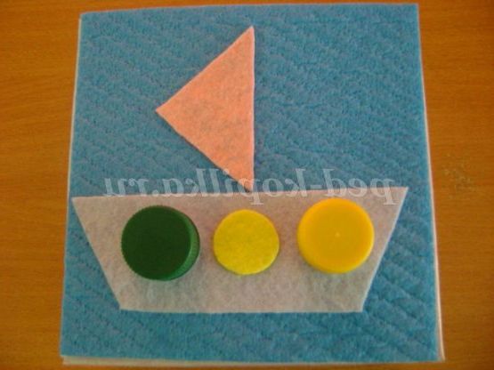 Хід гри: вихователь пропонує дитині розглянути готову картинку, наприклад, «Кораблик», «Метелик», «Ягоди вишні» і пропонує підібрати пробку за зразком. Дитина виконує завдання і називає використовуваний колір пробки.