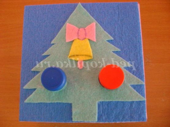 Хід гри: вихователь пропонує завдання: «Прикрась ялинку», «Зроби квіти на галявині яскравими». Діти використовують колірну гаму пробок по вибору, називають колір.