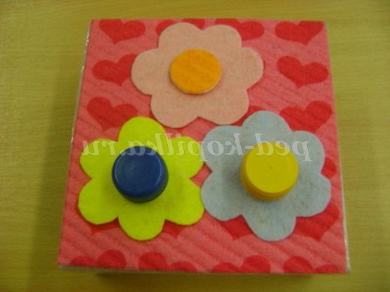 Опис матеріалу: посібник виготовлено з метою розвитку у дітей дрібної моторики рук і сенсорного розвитку. Можна використовувати для індивідуальної роботи та групових занять з дітьми. Посібник мобільно і багатофункціональне. Основа допомоги одна, а змінних килимків кілька. Килимки можна зберігати в окремій коробці, а можна зберігати на основі посібника, як колечка пірамідки.