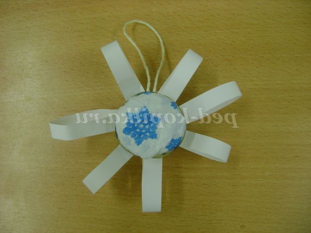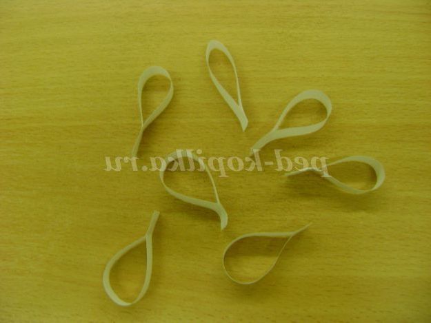 4. Ми візьмемо для сніжинки 6 «петельок». На перевернуту клітинку заповненої з серединкою з допомогою клею " момент " наклеїти «петельки». Виконує педагог, так як клей токсичный.Можно довірити виконати це завдання дитині, якщо замінити використання клею на двосторонній скотч.