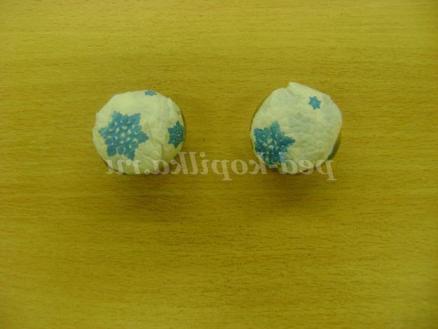 2. Взяти 2-е паперові серветки будь-якого кольору. Зім'яти кожну таким чином, щоб вийшли кульки. Вставити кульки в осередку. Можна на дно комірки капнути клею, щоб серединка у вигляді серветок закріпилася і не випадала. Виконують діти.