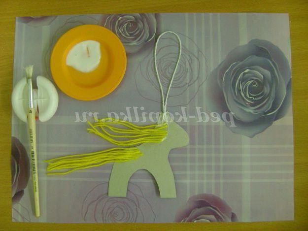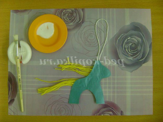 4.Наметив місце, де буде у конячки хвіст, мастить його клеєм. Бере підготовлені для хвоста нитки пряжі пучком і накладає на промазанное клеєм місце, розподіляючи нитки так, щоб вони всі лежали на картоні.
