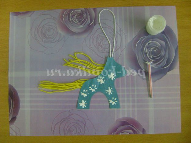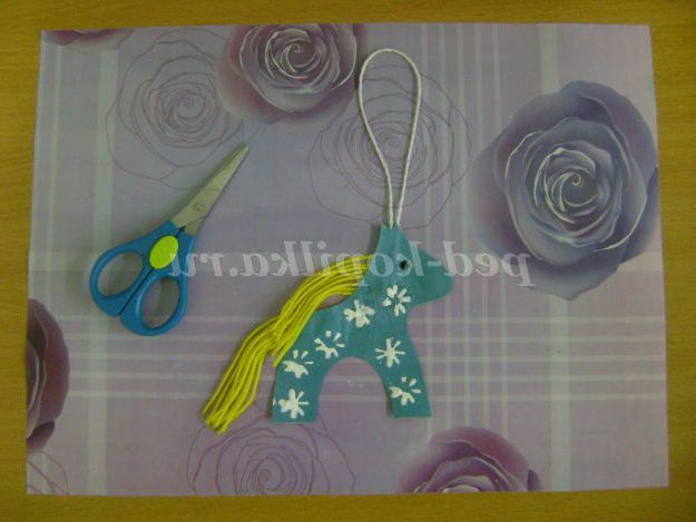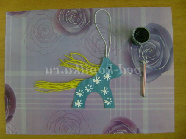 Можна зробити їй конячок-подружок. Гриву і хвіст однієї конячці можна зробити білосніжними за допомогою вати. Прикрасити можна за допомогою блискучих зірочок з фольги, зроблених за допомогою фігурного діркопробивача. Конячки разом будуть прикрашати ялинку. І послужать талісманами Нового року.