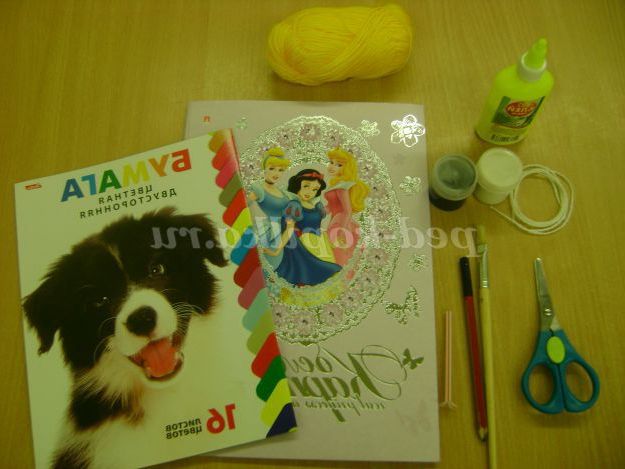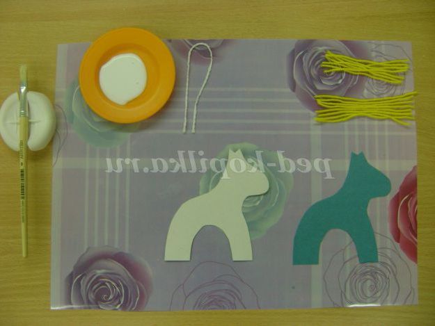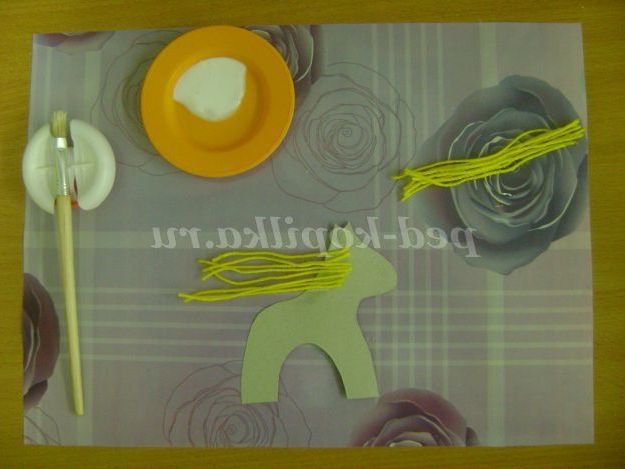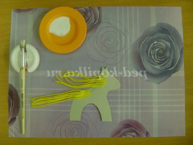 3.Дальше роботу виконує дитина. Намітивши на картонної заготівлі місце майбутньої гриви, намащує клеєм за допомогою пензля. Бере по ниточці і акуратно накладає на місце, промазанное клеєм. Притискає пальчиком.