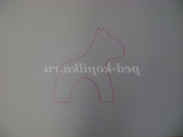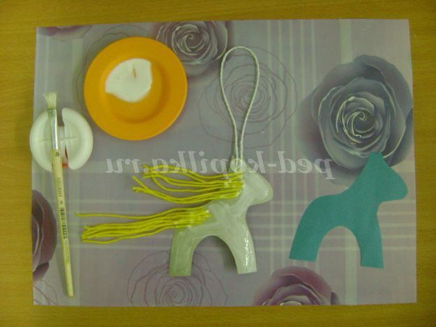 1.Нарисовать конячку на картоні - це буде шаблон для майбутньої вироби. Вирізати. Це підготовчий етап. Виконує педагог.