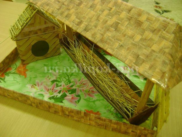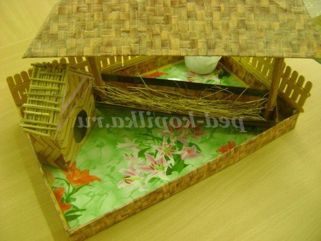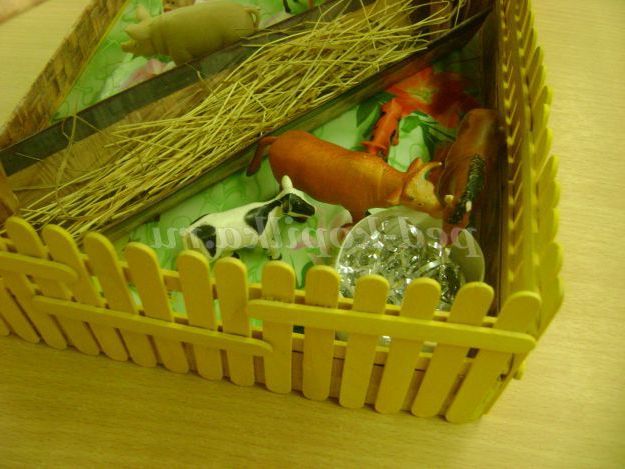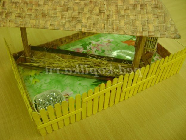 Макет виготовлений з порожньої коробки з-під взуття, стінки коробки зроблені у вигляді паркану. Для цього знадобилися палички від морозива.