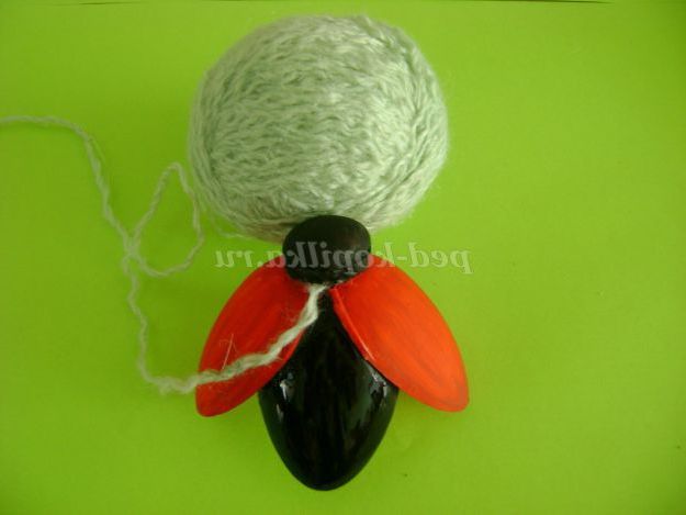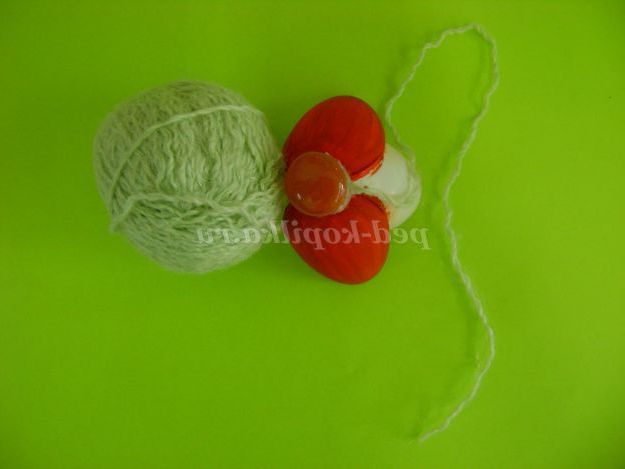 5.От клубка ниток відрізаємо нитку довжиною приблизно 20-25 см. Колір ниток може бути будь-якою. Довжина нитки може бути різною, в залежності від того, куди ми потім прикріпимо божу корівку.