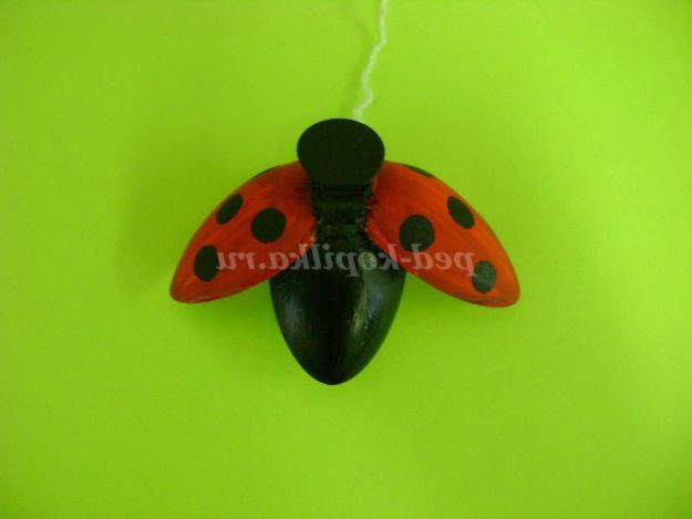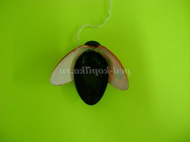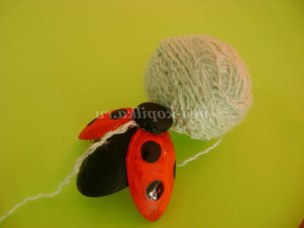 Декоративний камінчик виявився важким. Він переважує тулуб, коли божу корівку подвешиваем.Чтобы вийти з положення, нитка довелося завести по лінії з'єднання голови з тулубом назад, за голову(це місце промазування клеєм) і приклеить.Нить тепер за головою, ближче до крил. Можна закріпити нитку клеєм Момент або за допомогою клею-пістолета.