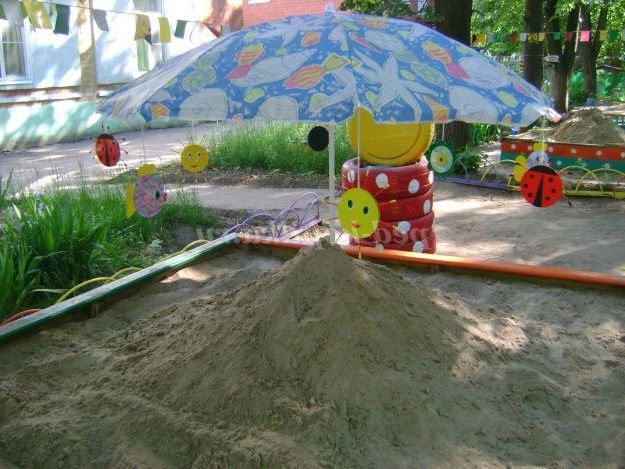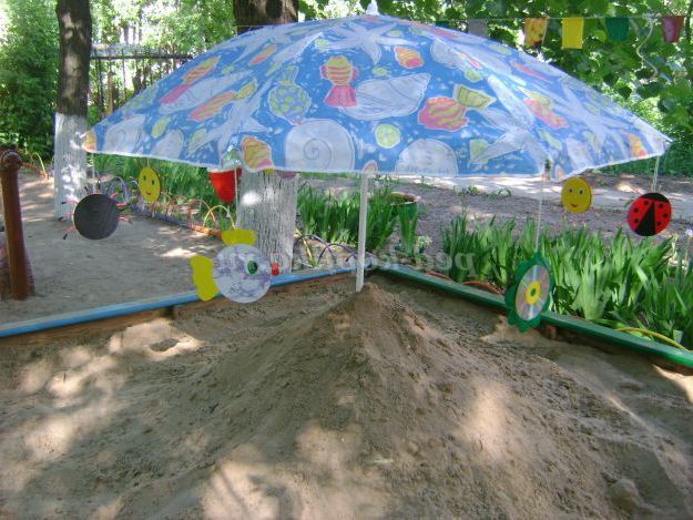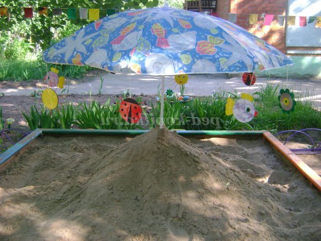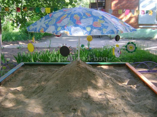 Зонт ми виносимо в жарку сонячну погоду і закріплюємо в купі піску в пісочниці.