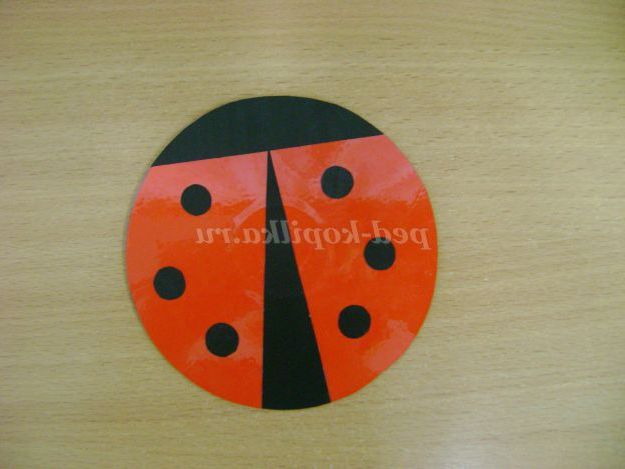4. Будемо оформляти диск з червоною поверхнею. Це спинка божої корівки. Наклеїв посередині деталь чорного кольору - тільце.