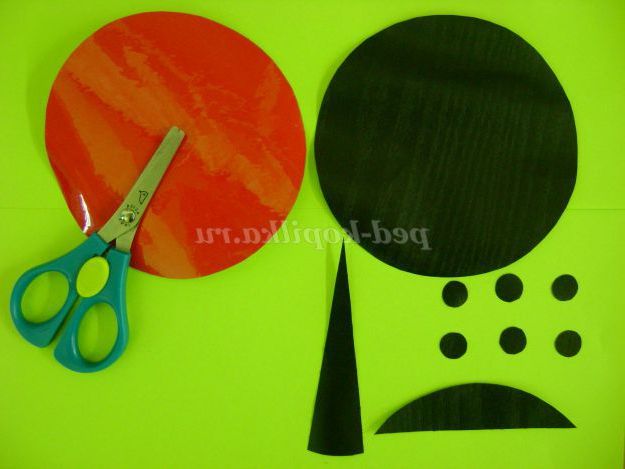 2. За допомогою шаблонів виріжемо з кольоровою клейкою папери 2 кола: чорного і червоного кольору, деталі чорного кольору для оформлення голови, тельця і гуртки чорного кольору для оформлення точок на крилах.