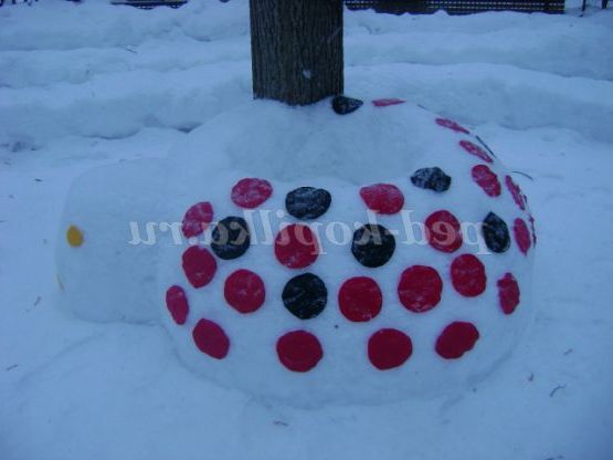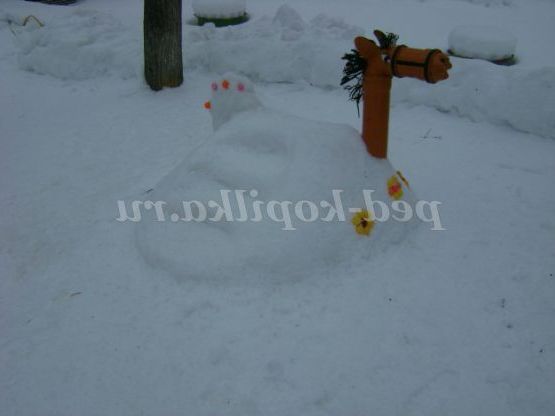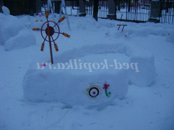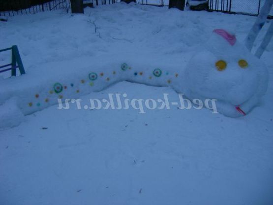 Організовуючи прогулянки взимку, ми також намагаємося створювати умови для активної рухової діяльності дітей. Прекрасним будівельним матеріалом служить сніг, з якого ми робимо снігові споруди не тільки для веселих ігор дітей, але і з метою виконання фізичних вправ на свіжому повітрі. Вони стають відмінним сніговим фізкультурним обладнанням до приходу весни. Споруди намагаємося робити багатофункціональними, яскравими. Прикрашаємо викидними матеріалом і шматочками тканини.
