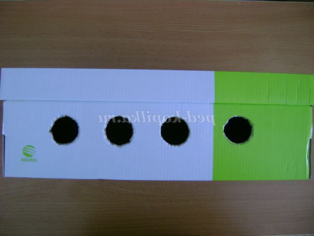 5. Беремо коробку з-під взуття, кладемо її на задню грань таким чином, щоб перед нами була передня поверхня. Беремо баночку з-під гуаші, ставимо її на відстані приблизно 7 см від краю і обводимо дно. Нижня частина баночки по діаметру менше верхній частині, по формі - коло.