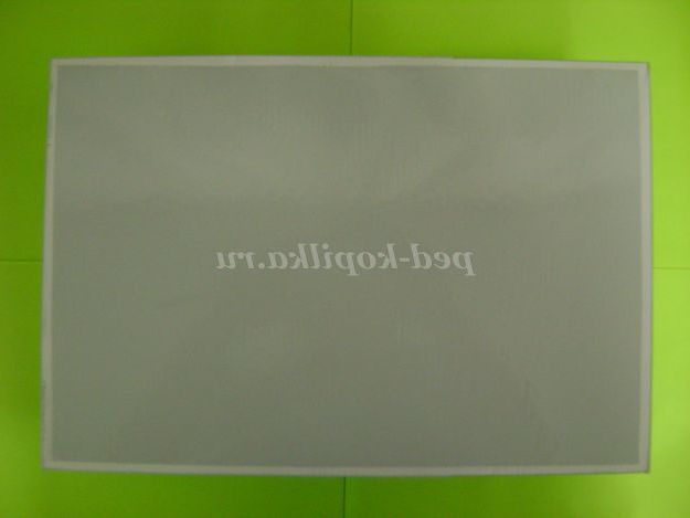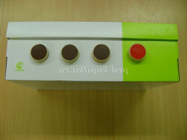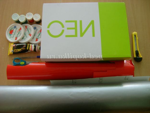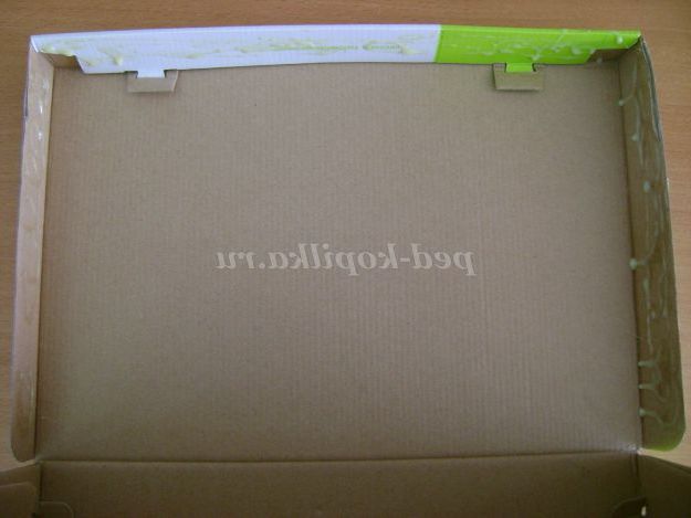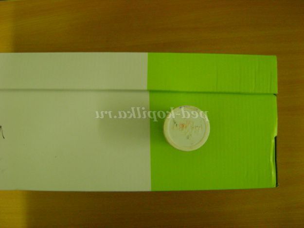 10. Повернули коробку догори дном. На ній є написи, їх ми приховаємо з допомогою самоклеючої плівки.