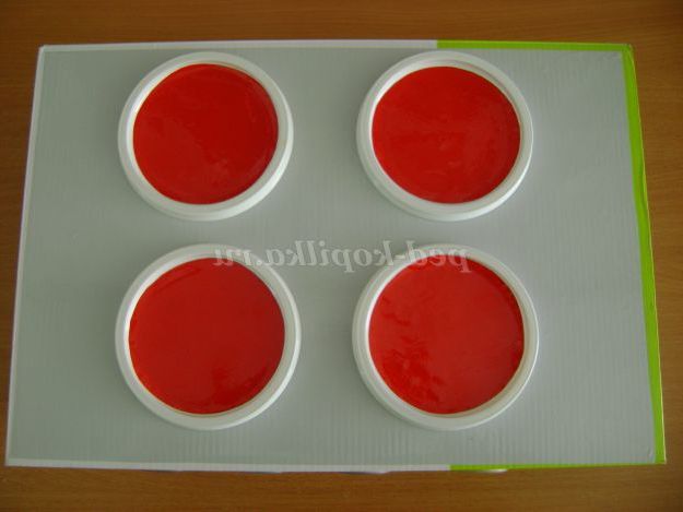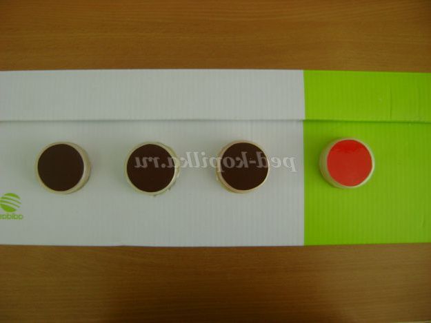 8. Закрили баночки кришками. З допомогою шаблону № 2 вирізали з самоклеючого паперу 4-е кола. Одне коло у нас вийшло червоного кольору, а 3 інших кола коричневого кольору.
