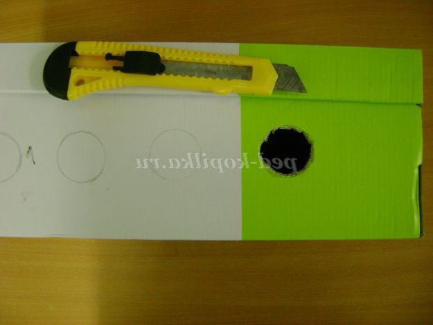 6. Взяли канцелярський ніж і вирізали перше отвір ліворуч. Вирізати треба акуратно, дотримуючись внутрішнього обідка кола.