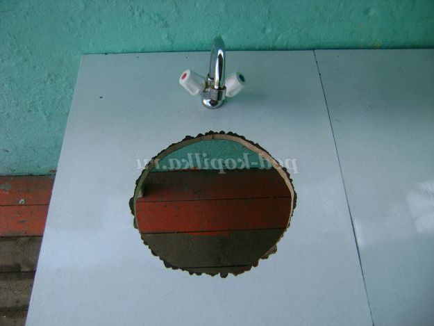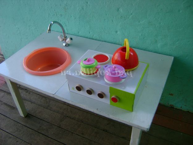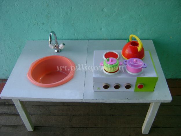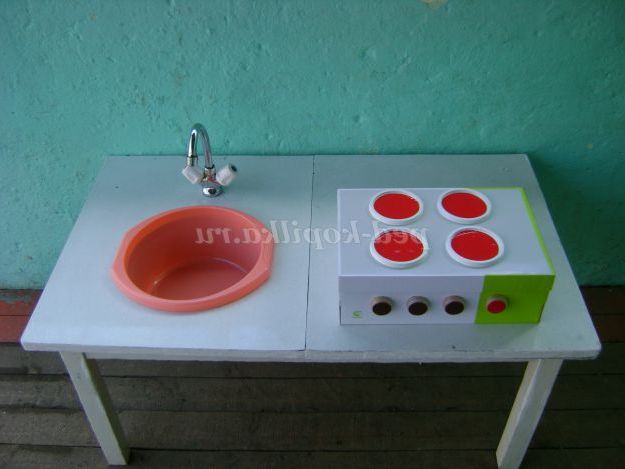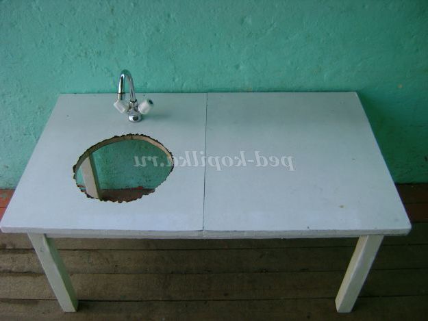 Скоро літня пора, діти багато часу проводити на свіжому повітрі. Плиту будемо використовувати в якості виносного матеріалу при організації сюжетно-рольових ігор. Для гри знадобиться ще мийка. Зробили її також своїми силами. Для цього взяли стіл. Поставили його на веранду близько до стіни. Вирізали отвір для тазу. Врізали змішувач. Цей вид роботи допоміг здійснити один з батьків.