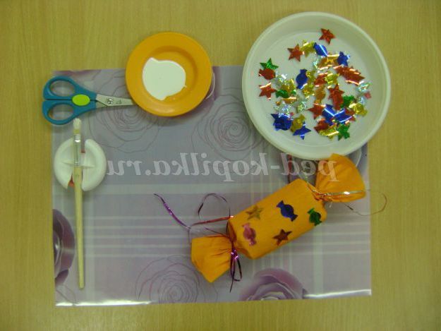 Відмінний зразок. Давайте розглянемо цукерку. Рулончик загорнуто в обгортку, яким послужить гофрований папір, кінці загорнуті і зав'язані з допомогою дощику. Не забудьте зробити петлю, щоб цукерку повісити на ялинку