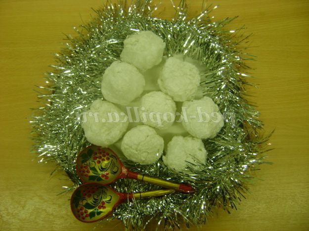 Обладнання: 2-е дерев'яні ложки, сніжки з вати, мотузочок, матеріали для художньої творчості: клей ПВА, кисті, гофрований папір, ножиці, ялинковий дощик, рулончики з картону, зірочки і сніжинки, зроблені за допомогою фігурного діркопробивача, чупа - чупси як сюрпризні моменти, ялинка, музика на диску дитячих пісень з мінусами на зимову тематику.