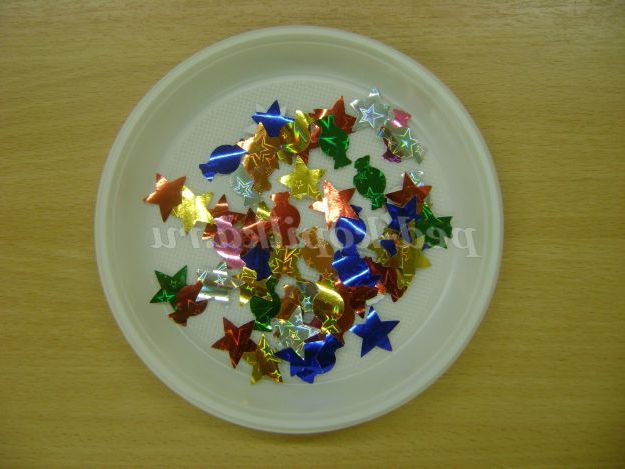 /педагог роздає в тарілочках фігурки зірочок та сніжинок з металізованого паперу, діти прикрашають цукерки/