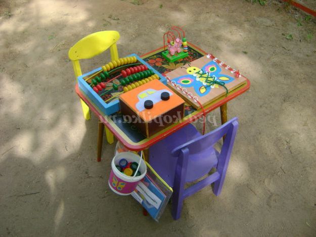 Для ігор з пробками з фанери зробили куб, у верхню поверхню вставили горлечка від пластикових пляшок і закріпили. Зробили з універсальних серветок накладні килимки-картинки. Можна підбирати пробки за кольором до кожної картинці-композиції. На ніжці столу прикріплено гачок, на який повісили відро з набором пробок і набір килимків-картинок. Стільці взяли на складі, пофарбували їх у яскраві кольори. На столі обладнання закріпили таким чином, щоб можна було грати одночасно групі дітей, підходити до столу можна з різних сторін.