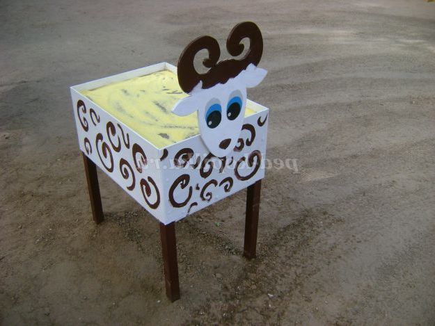 Баран зроблений з фанери, для ніг використані дерев'яні бруски. Зверху закріплено оргскло. Для малювання можна використовувати і пісок.