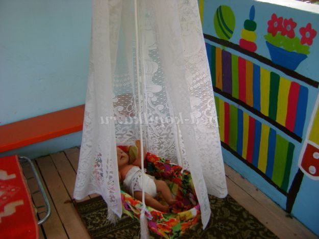 Постелили килими. Поставили стару розкладачку. На гачок в стелі підвісили колиску. Зробили її зі старої коляски, яку обшили яскравою тканиною, тюлю і мотузки.
