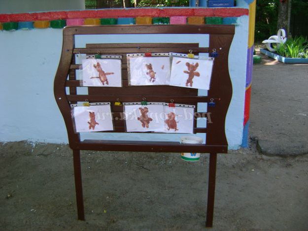 Використана спинка від дитячого ліжка, дерев'яні бруски, дріт, канцелярські цвяхи та затискачі. Із зворотного боку прикріплено фанера для малювання крейдою. На ніжці закріплено відро для води. Там є і ганчірочка, яку діти можуть використовувати для стирання зображення.