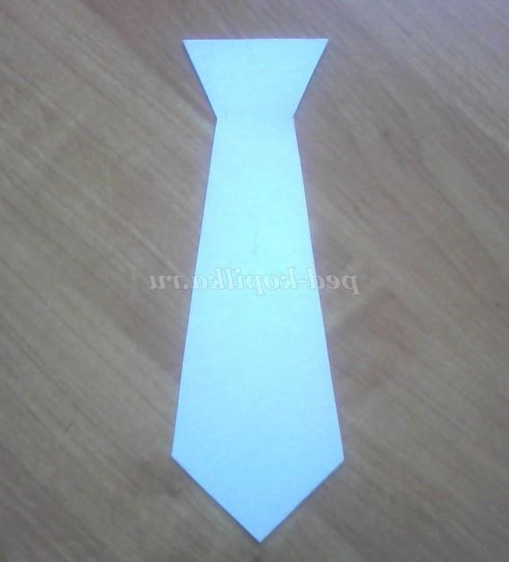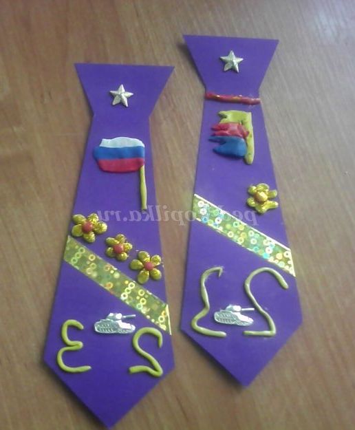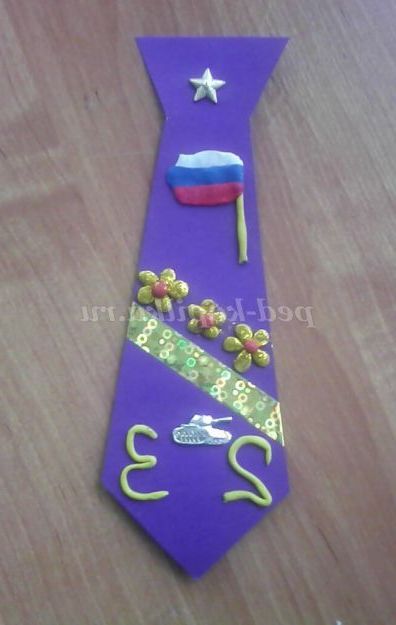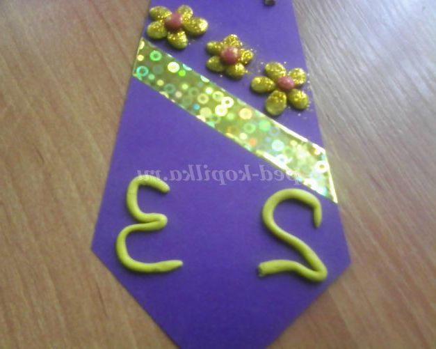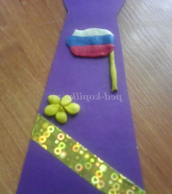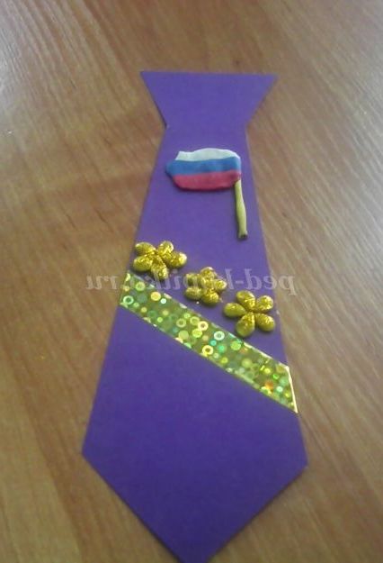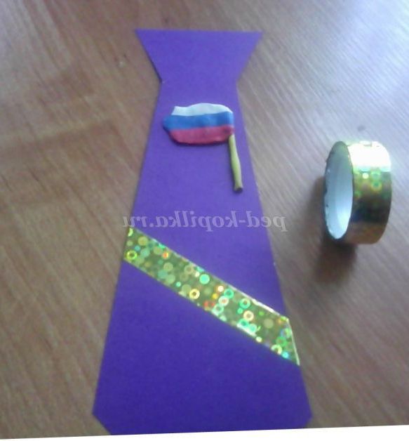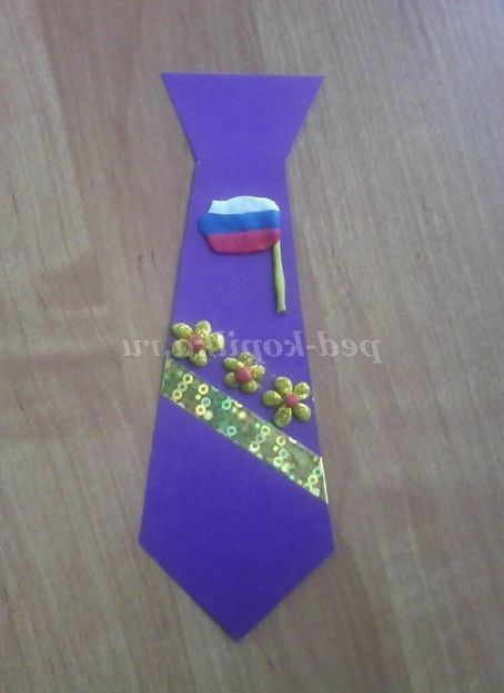 Краватка вирізаємо з кольорового паперу фіолетового кольору. У верхній частині краватки прикріплюємо приплюснутий «прапор», як показано на фото.
