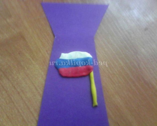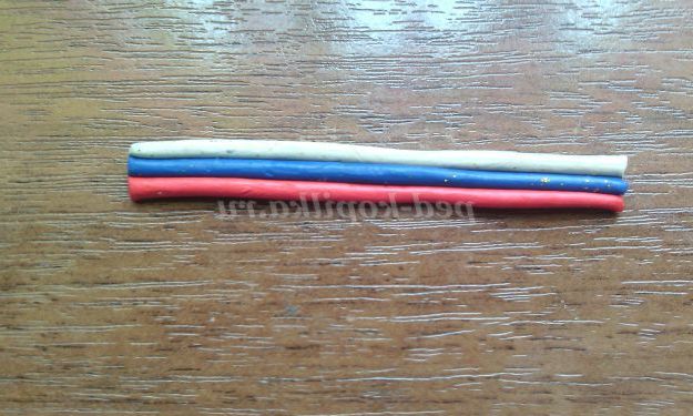 З пластина виготовимо прапор Росії. Для цього необхідно розкачати тонкі джгутики білого, синього і червоного кольору (довжина 3 сантиметри), як показано на фото.