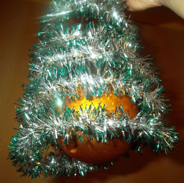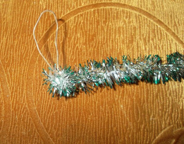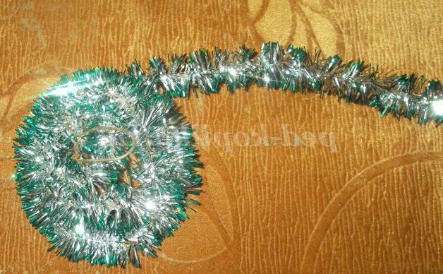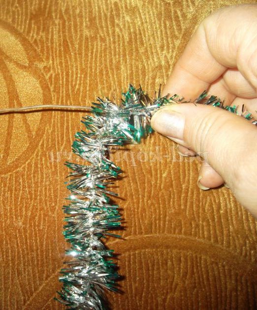 Спочатку необхідно по всій довжині дроту намотати мішуру, як показано на фото.