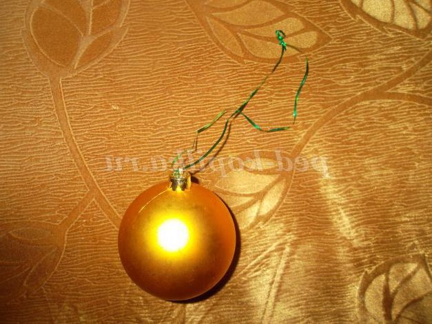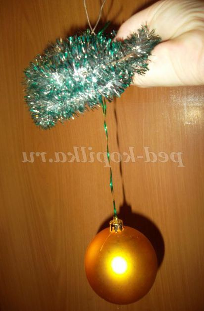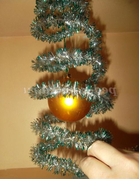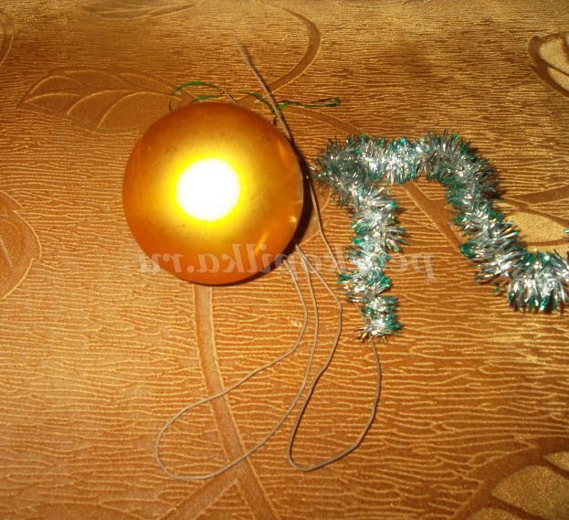 Далі беремо ялинкова куля, прив'язуємо до нього нитку новорічного дощику довжиною 18 сантиметрів.