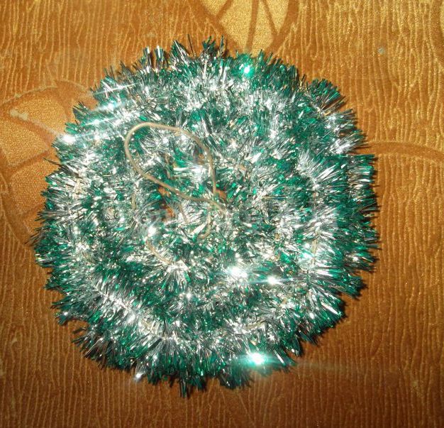 Матеріал: дрібна мішура зеленого кольору 3 метри, дріт 2,5 метра, ялинкова куля, зелена нитка новорічного дощику.