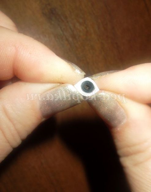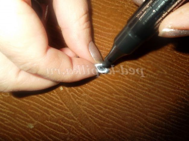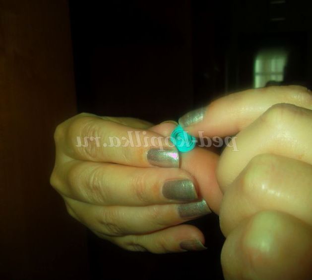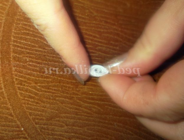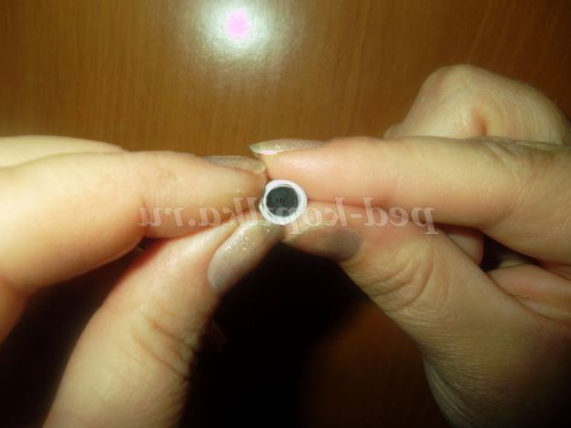 Потім беремо смужку і чорною стороною вставляємо в отвір інструмента так, щоб смужка трохи вийшла (1-2 мм) і починаємо скручувати в тугу спіраль.