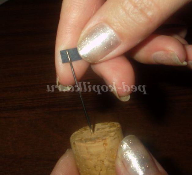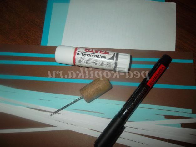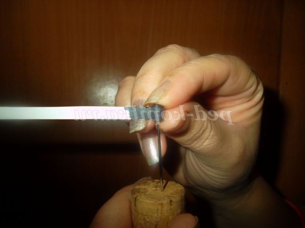 Папір необхідно розкреслити смужками шириною по 5 міліметрів, смужки розрізати. Пропоную виготовити самостійно інструмент для скручування паперу з пробки і голки з великим вушком. Верхню частину голки спилюємо до появи «вилки», гострим кінцем встромляємо в пробку.