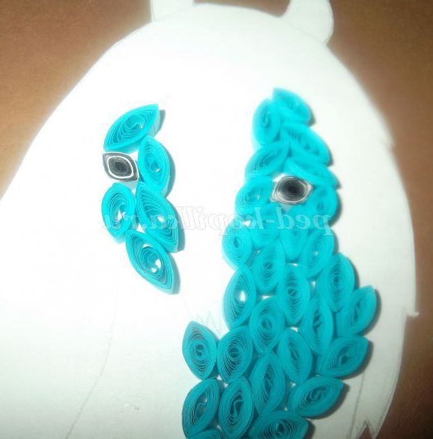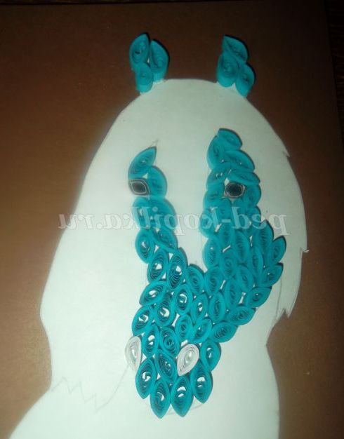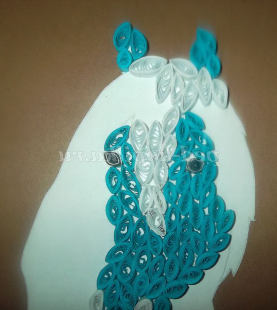Грива білого кольору. З білих смужок виготовляємо спіральки різного діаметру, надаємо їм форму «листочок». Тулуб блакитного кольору.