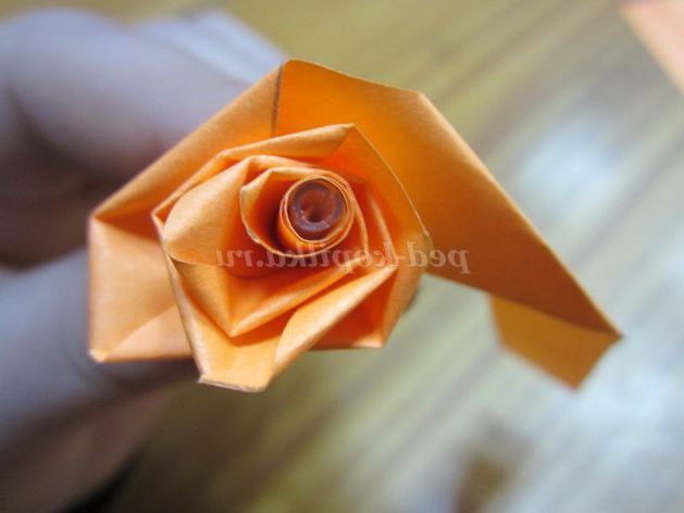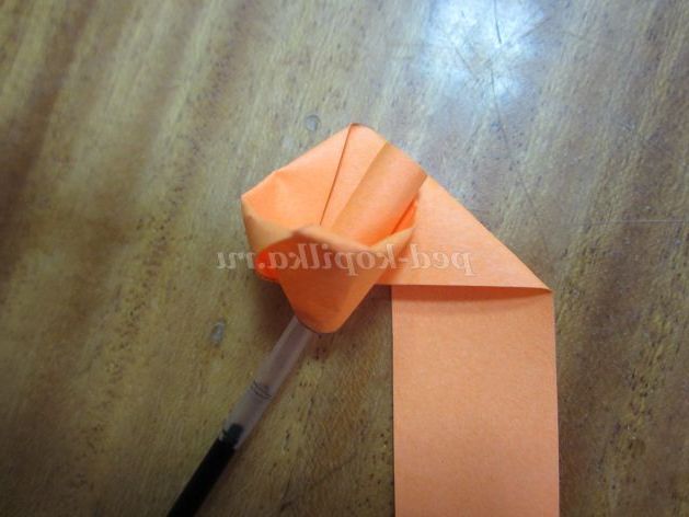 Продовжуємо загинати і закручувати смужку. Кінець смужки підверніть під квітка і приклеюємо. Коли клей трохи підсохне, акуратно знімаємо троянду.