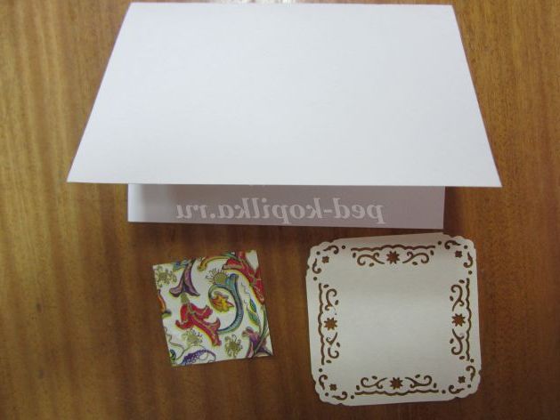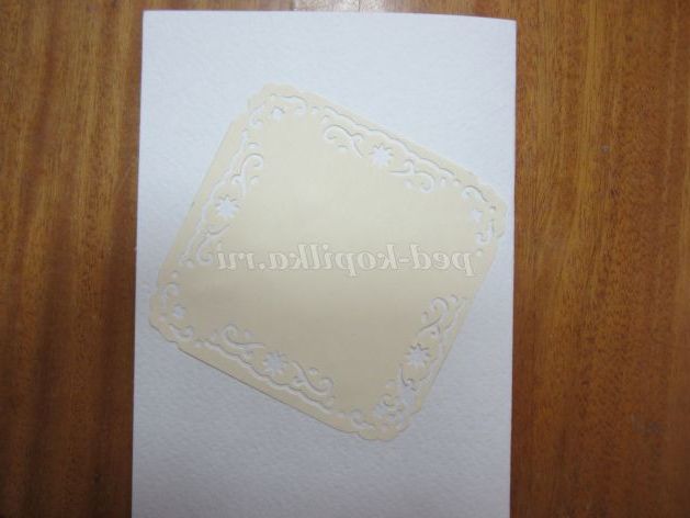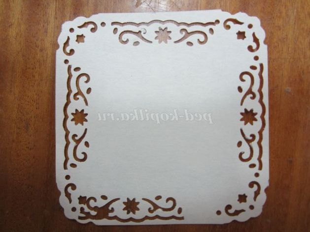 З офісного паперу бежевого кольору вирізаємо квадрат зі стороною 8 див. Фігурним дироколом робимо візерунок.
