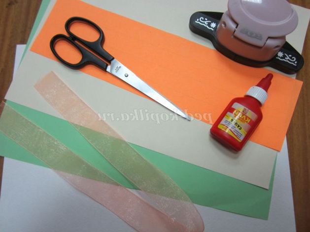 фактурний картон (білий), кольоровий офісний папір бежевого, зеленого, помаранчевого кольорів, папір з малюнком, стрічка (ширина 1 див.) довжиною 20 див, ножиці, клей ПВА, фігурний дирокол.