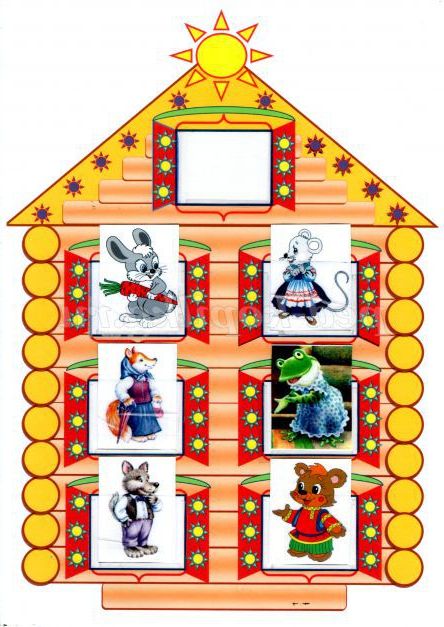 Педагог зображує персонажів казки: мишу, жабу, зайчика, лисицю, вовка, ведмедя. Дитина відгадує. Потім дитина і педагог міняються ролями.