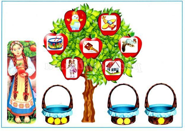 На яблуні незвичайні яблука, з картинками. Назвіть картинки, визначте кількість складів у кожному слові і розкладіть яблука-картинки по кошиках.